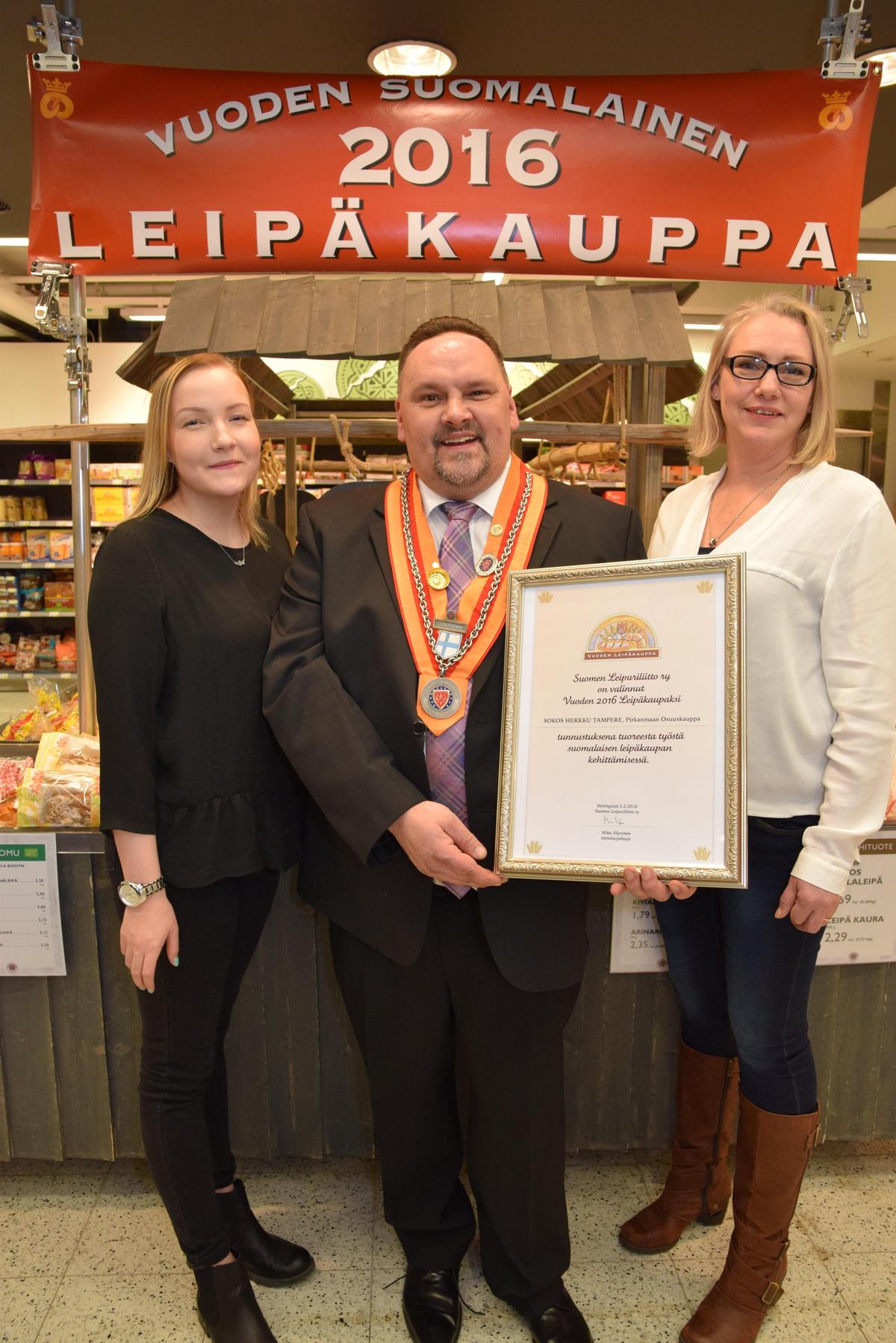 Vuoden 2016 Leipäkauppa julkistettiin Tampereella 3.2.2016. Leipäosaston hoitajat Mira Salonen ja Regina Roomets palkittiin kultamitalein ja kultamitalin sai myös Sokos Herkun myyntipäällikkö Timo Pitkäranta.
